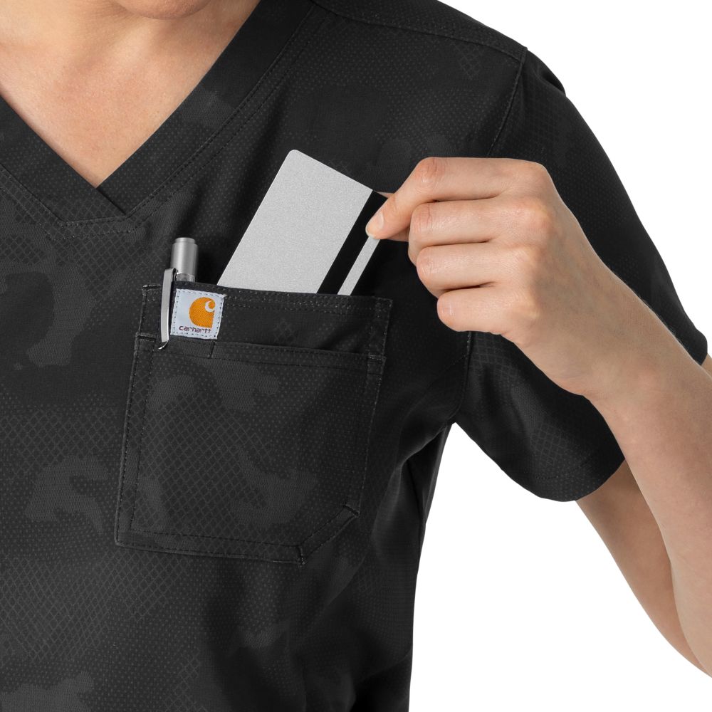 The Carhartt fabric technologies are an absolute expectation from the Carhartt wearer and this style is no different. This scrub top features the Rugged Flex® technology that offers stretch and comfort designed to move with you on the job. The flattering and slightly more feminine curved v-neckline combined with the princess seaming in both front and back offer a stylish look. The curved shirttail with side hem vents offers a tuck-in option or a fashionable untucked version of this shirt. The back features a vented mesh-lined panel for breathability and comfort. Of course, the badge ID loop in the shoulder seam, the layered chest pocket with a pen slot, and the dobby stretch fabric come together for a functional and comfortable scrub top.